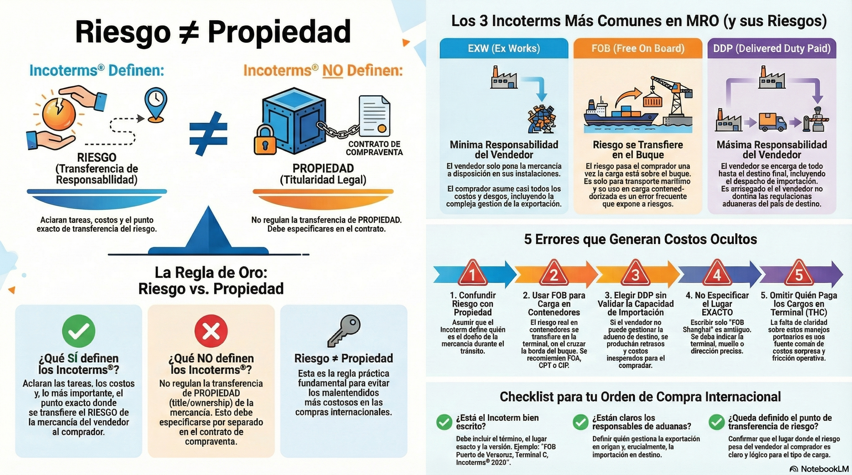 Incoterms no regula el traspaso de propiedad (title/ownership): solo cubre el riesgo durante la entrega y cómo se reparten costos. Eso debe definirse en el contrato de compraventa.