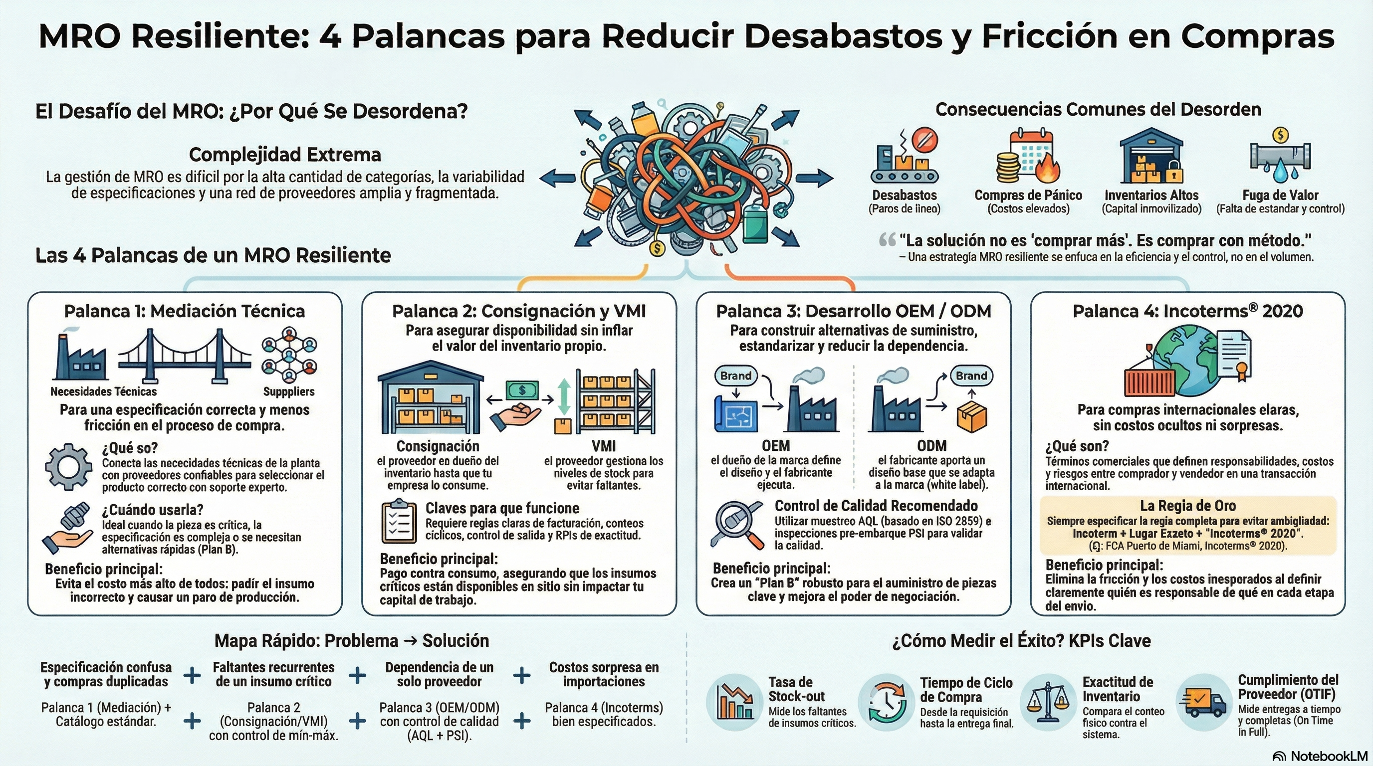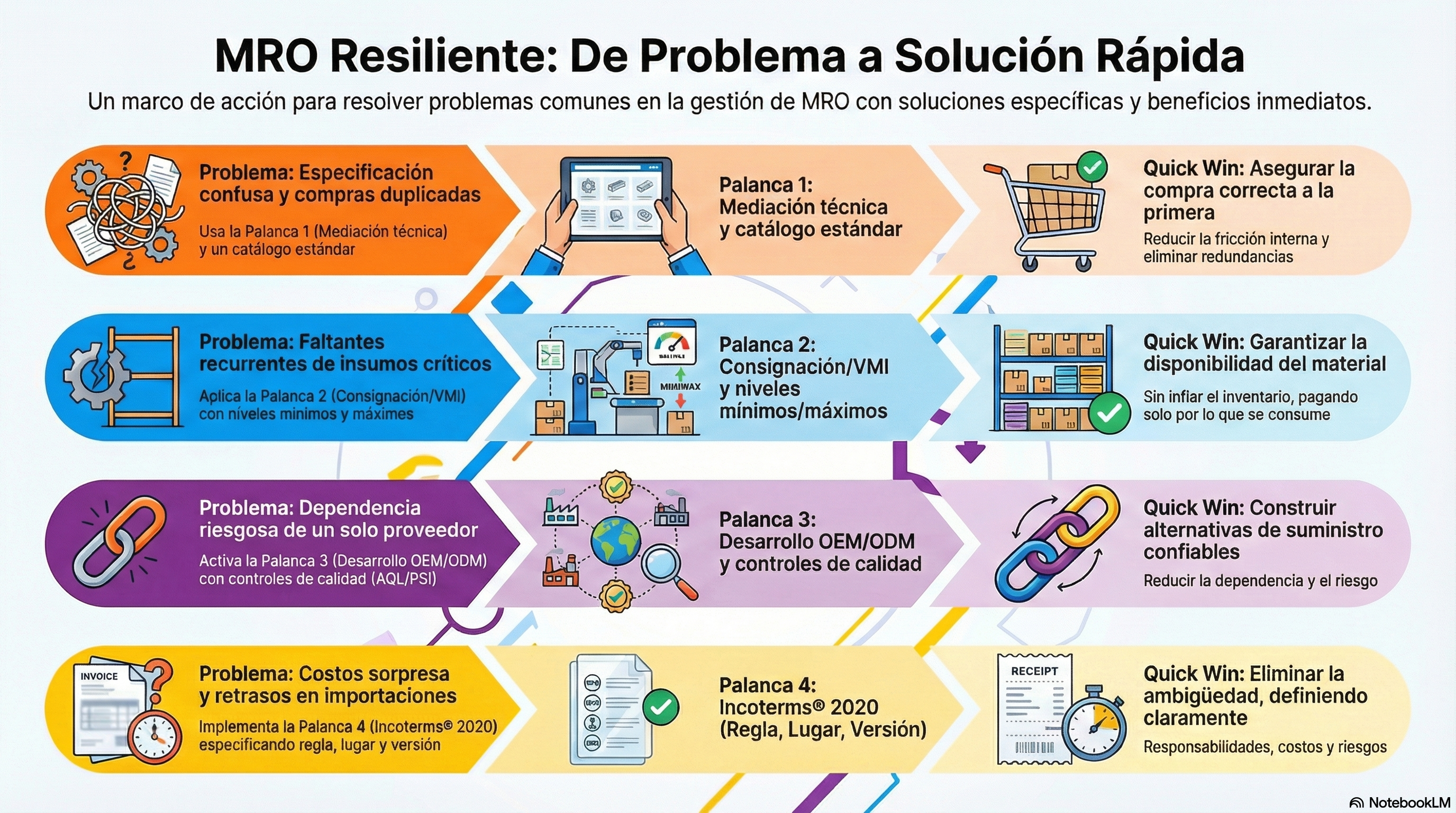 Una estrategia MRO resiliente busca asegurar continuidad operativa con menos fricción y menos “compras urgentes”. En la práctica, puedes construirla con 4 palancas complementarias: